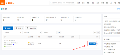 5. 購(gòu)買成功后返回SSL證書控制臺(tái)點(diǎn)擊申請(qǐng)證書